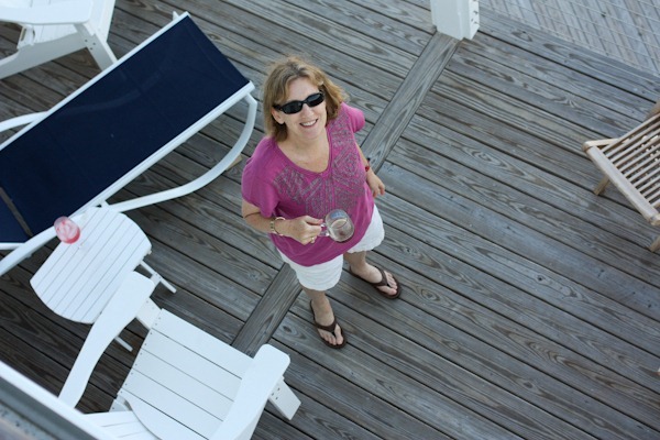 I love taking photos, and I love documenting our vacations. But I don’t love writing long paragraphs! We had a great first day at the beach, beginning with a lunch at The Pilot House in Wilmington. Our house is awesome, and the weather today was great. Only downfall was slamming my thumb in the balcony door within 30 seconds of arrival! It was some of the worst throbbing pain I’ve felt (and I practiced being in labor!) Mom and Dad arrived this afternoon and Larbs and Matt, just before dinner. We had a lovely feast of burgers (Cville beef Karen brought!) prepared by Karen and Matt (we’re taking turns cooking the dinners) and ended the night with an awesome cookie cake baked by my mom to celebrate Larbs and Matt’s engagement this week!