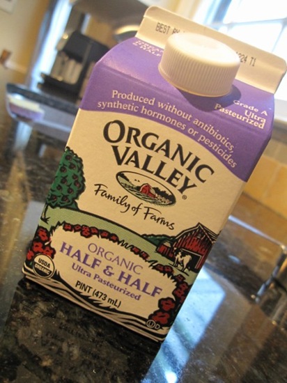 Here’s the deal: Organic milk is expensive, organic soy milk from Costco is shelf stable and cheap. Soy milk cannot go in coffee (don’t worry, I have tried every combo with no success). Therefore, for coffee we need something in the fridge in addition to soy milk. I don’t really care for skim milk in coffee (1-2% is my favorite) so I thought we could try bumping up to half and half, which is less expensive, comes in a small container and supposedly lasts longer. I use about 2 tbsp of milk in my mug so I thought maybe 1 tbsp of H+H would be equivalent.