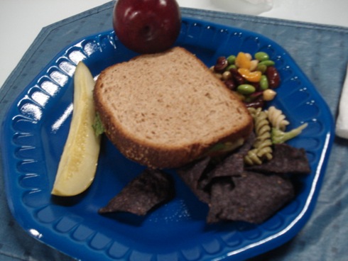 I packed my lunch (sandwich, plum, cottage cheese) not knowing they would be providing something for the exhibitors. I went half and half – my sandwich (turkey, avocado, romaine, jalapenos) with their sides: pickle (x2!), some bean salad, 2 pasta salad noodles and some blue corn chips.
