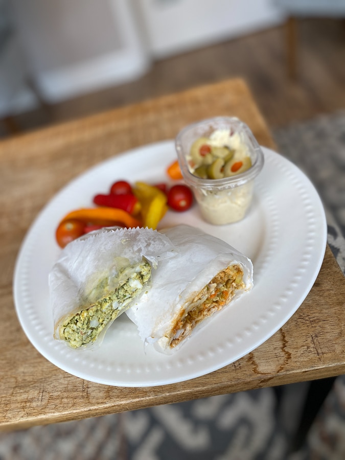 She wowed me with two wrap halves, veggies and hummus (with an olive garnish) and homemade cheesecake!