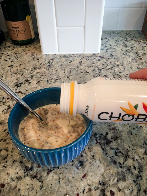 Oatmeal for breakfast cooled down with a splash of drinkable yogurt!
