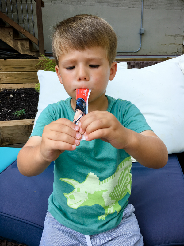 Later that day we made a fort and had popsicles for a snack. I’ve been freezing the yogurt tubes as popsicles for ages, and I love that he still thinks they are a treat (probably because they do taste like ice cream!) Let me pause to say that Mazen was THRILLED with the superheroes on the packaging. I’ve never seen him think a food was more cool than when he was naming all the guys on the tubes and picking out his favorite. Batman for the win!