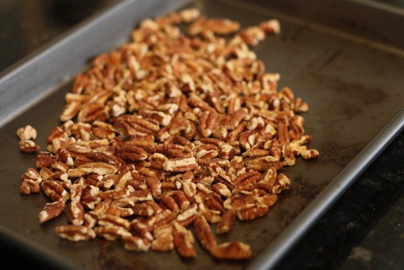Toast nuts in the oven until fragrant, about 4 minutes at 400*, or toast in skillet, being careful they don’t burn
