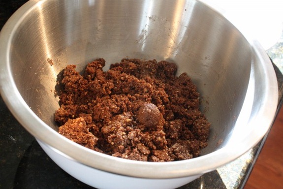 Combine bourbon with corn syrup or honey. Add to crumbs. Use hands to combine like so: