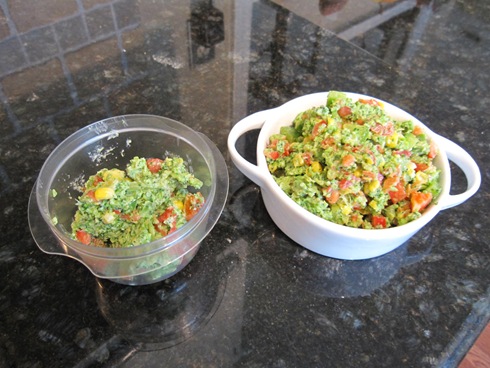 Then I pulsed in (just 2 pulses) chopped red and green pepper (~1/2 cup) and about 1/3 cup frozen/thawed corn –