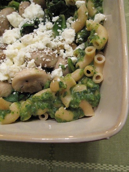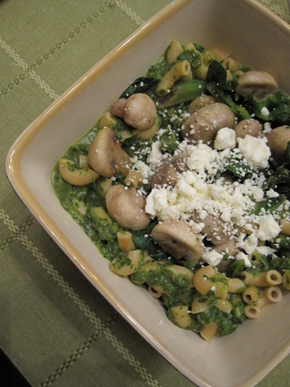 Makes about 2 cups of sauce. Each of our bowls had 1 cup cooked elbow noodles, ~3/4 cup sauce and another half cup of greens + shrooms saute. Garnished with feta. We had about half a cup of sauce leftover.