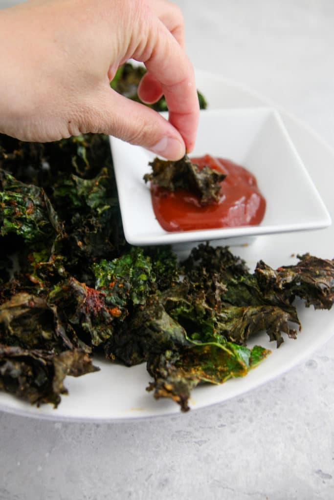 Eat your air fried kale chips with ketchup if you have that salty french fry craving! I also like an aioli (like the one I made for the avocado fries with sriracha!) BBQ sauce, ranch dressing, and pesto also make great dips.