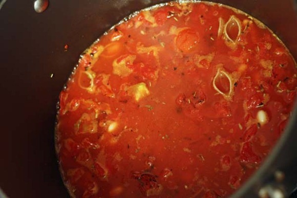 - Meanwhile, combine broth, tomatoes, beans, garlic and herbs and bring to a boil.