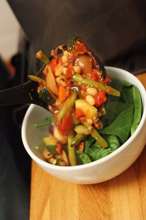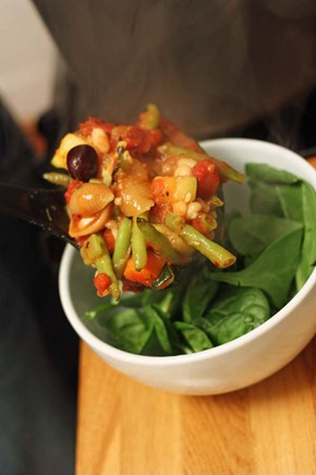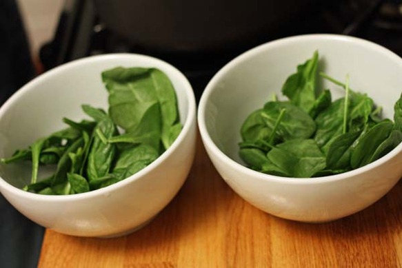 - Place spinach into bowls and pour soup on top.