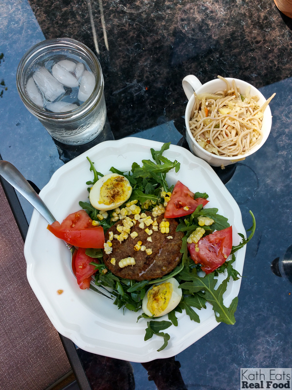 Sarah had burgers, deviled eggs and soba noodles leftover from a cookout, so we ate up the leftovers on top of salads. It was so nice to sit outside!