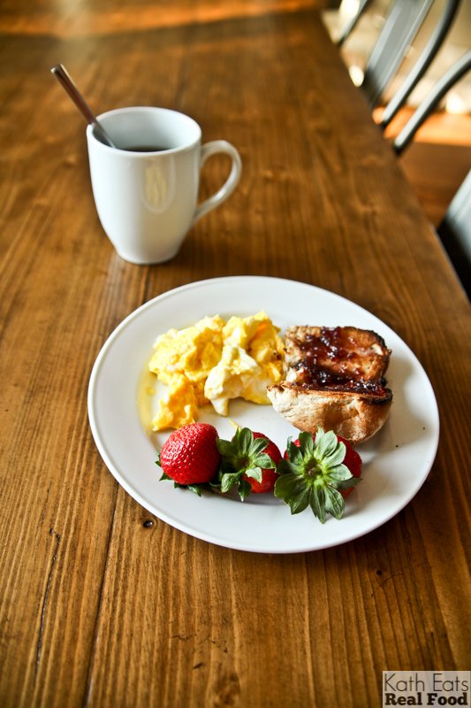 Breakfast this morning was scrambled eggs, a Virginia roll with jam and a few big strawberries. Plus hot tea!