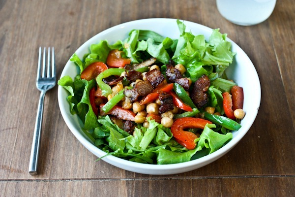 Garden lettuce (!!), bell pepper, local bacon we pulled from the freezer, garbanzos from the pantry. Matt sauteed the toppings all together and served them over the greens.