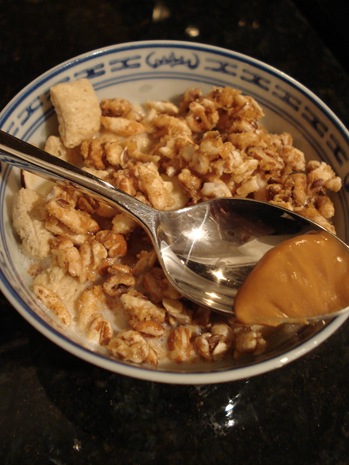 We weren’t due to our party until 7:30. I had planned to have a yogurt + a salad for a light dinner but wasn’t that hungry. But around 6:30 I figured I should have a little something so I just has some Kashi GoLean Crunch, Puffins, soy milk + a tiny bit of Barney Butter.
