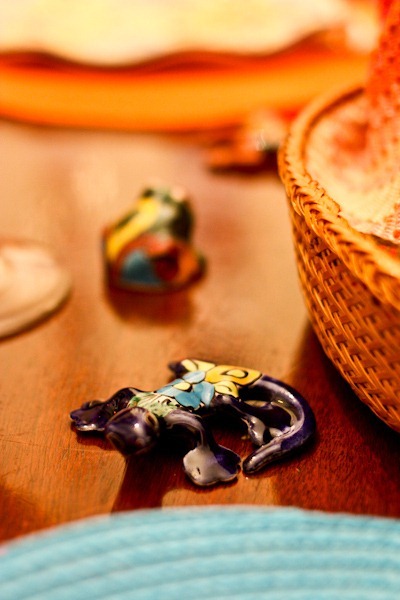 From The Hostess: The place mats, napkin, and napkin rings and glasses are all from Pier 1. I found the plates at TJ Maxx. The ceramic creatures (frogs and geckos) are from Tecate, Mexico. It’s my fiesta look – served with an Italian meal…
