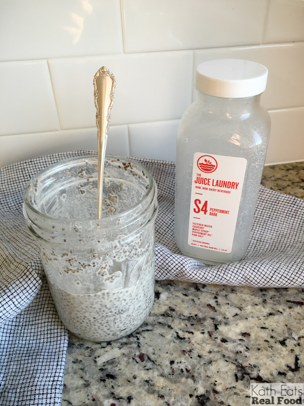 YOU GUYS. I am ob-sessed with this Peppermint Bark Cashew milk from The Juicy Laundry. In fact, I’m obsessed with everything they make! This milk tastes like melted ice cream and made the perfect base for some chia pudding! No other ingredients necessary – just 1/4 cup chia seeds and 1 cup of milk.