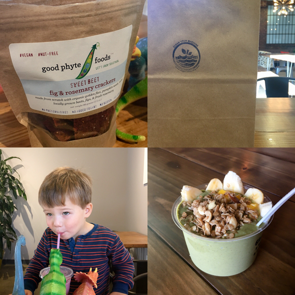 Yesterday we went to ACAC for strength class (which was hoppin’!) and then hit up the Juice Laundry for lunch. I had a spicy “Blaze” smoothie in a bowl with banana and granola on top. It was quite spicy from ginger and cayenne pepper! Plus banana, mango, kale, dates, strawberries and cashew milk. We also shared some Fig & Rosemary crackers and I bought more Peppermint Bark milk!!
