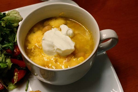 Our chili was topped with greek yogurt and shredded cheese and filled with chicken, corn, white beans, broth, and carrots.