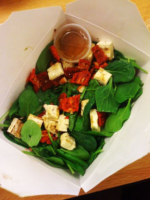 I packed my leftover salad with extra sun-dried tomatoes, leftover grilled tofu and some almonds. Plus a thing of sesame dressing.