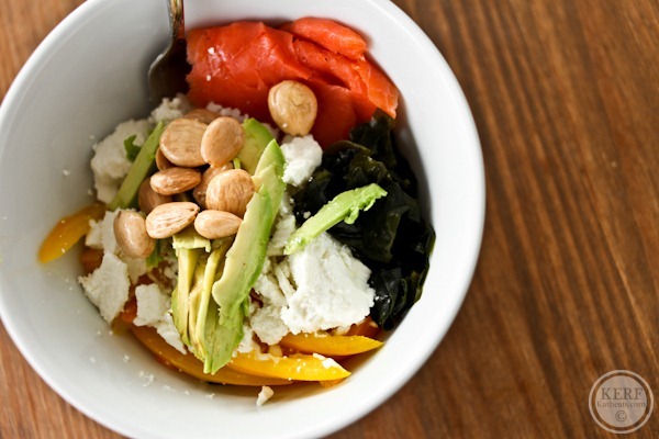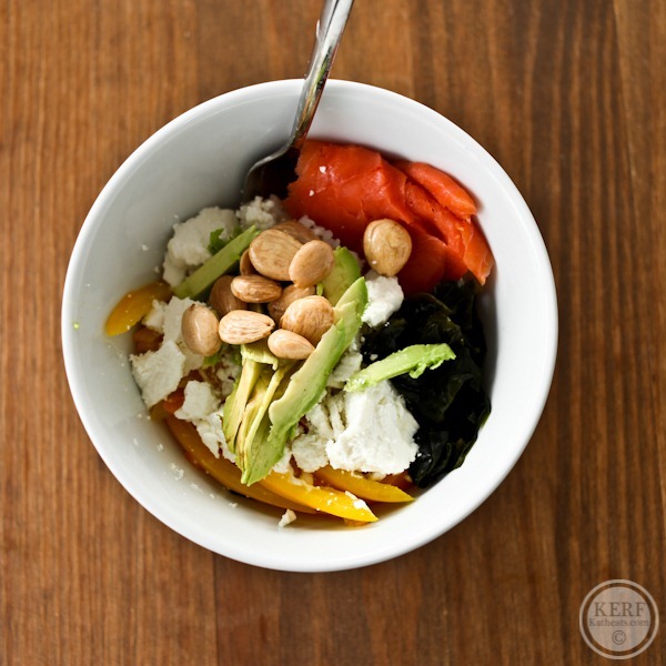 Layers of cooked wakame sea-veg, sushi rice, bell pepper slices, smoked salmon, goat cheese, avocado and almonds. Marcona almonds are SO buttery good!