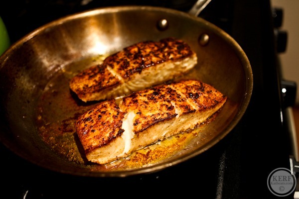 For our recipe tonight, we used a blackening spice (a generic one) and coated the fish with a generous amount. We filled our stainless steel skillet with a few tbsp of safflower oil (for its high smoke point) and seared one side of the fish until a nice crust had formed. Then we flipped it and put it in a 400* oven for about 10 minutes, or until the fish flaked with a fork. This fish cooking method never fails!
