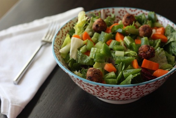 I made a Hugh Jass salad topped with Kelsey‘s goat cheese balls of last weekend plus a drizzle of agave and EVOO for dressing.