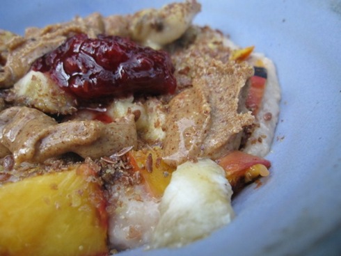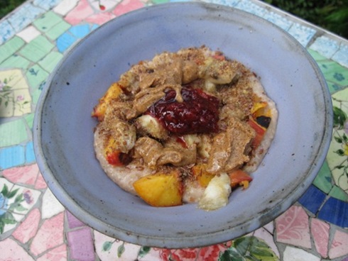 The I prepared some oat bran on the stove top (1 portion made with 1/3 milk, vanilla and salt) plus some dried raspberries and topped it with the 2 banana halves and 1 of the peaches. Plus flax, Ginger Rhubarb Preserves and Almond Haze from Veggie Girl.