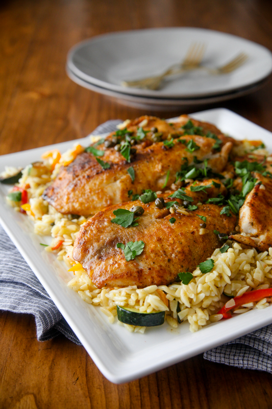 Tilapia Piccata with Orzo, Zucchini, and Sweet Peppers