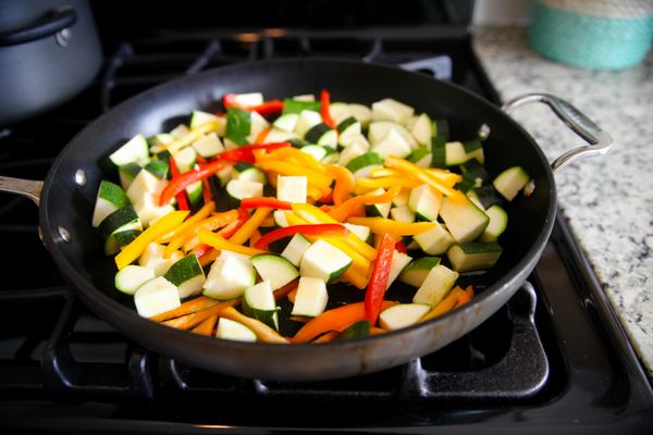 While the orzo bubbled away in a big pot, I cooked the veggies together with olive oil, chopped garlic, salt, and pepper.