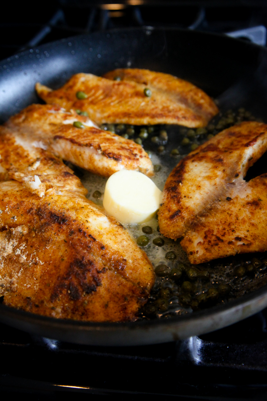 Next, I cooked the fish and made the sauce in the same pan. A lemon-caper-butter sauce is one of my favorite fish toppers. I can smell it through the screen!