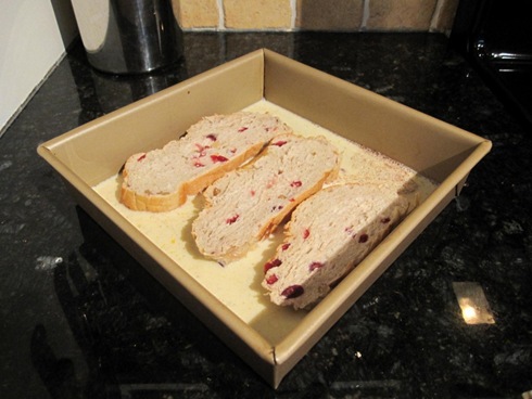 She sliced the bread and soaked it in an egg, milk, vanilla, salt, cinnamon, nutmeg mixture for about 5 minutes per side. (See Bites + Bowls later today for more info!)
