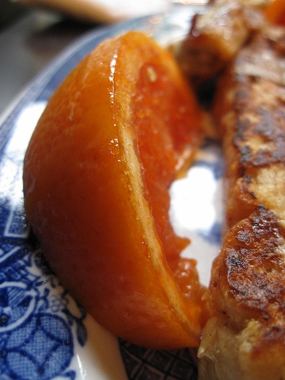 Nice breakfast!! I don’t even usually like french french toast, but that looks fabulous… impressive carmelized fruit, too 🙂