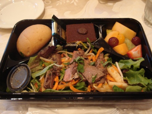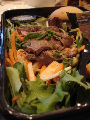 First – the lunch! Our choices were a grilled chicken breast sandwich , a veggie wrap (with onions) and a steak salad . Normally I’d never choose a steak salad because I’m just not a big steak eater, but it was the most appealing option so I did. It was actually delicious!! Best boxed lunch I’ve had in ages! The salad had steak pieces , cilantro, jicama, cucumbers, carrots , and an Asian dressing. So good!