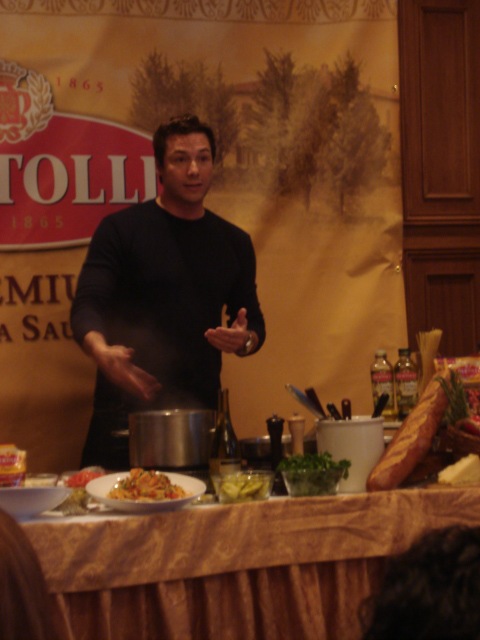 It’s fun to meet the other food bloggers!! I ate lunch across from Anna at Cookie Madness who is a KERF reader! Food bloggers got priority to attend a special food demo by Rocco DiSpirito sponsored by Bertolli Pasta Sauce . I came away with a Rocco cookbook and two sample pouches of Bertolli!