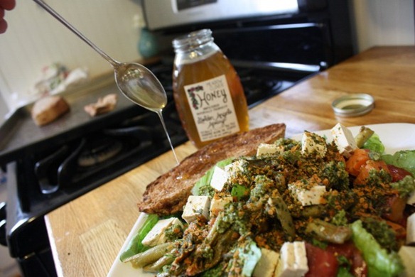 Romaine, roasted veggies, tomato, tofu, pesto clumps, kale granola [<– was indeed fabulous on a salad!]
