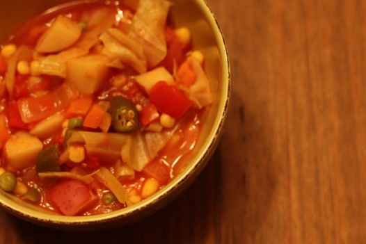 Ingredients included – cabbage, corn, peas, okra, potatoes, green beans, carrots, tomatoes, broth and more. It’s been soooo long since I’ve had a vegetable soup! So wonderful that it didn’t have tin can taste because it was fresh! [Oh, and ONIONS were in it but soup is the one thing I will eat because they are so simmered down you can’t taste them at all (so why even put ’em in!)]