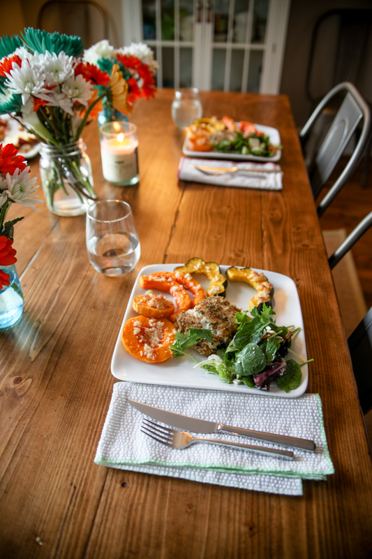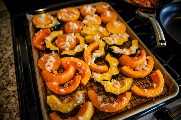 We panko-crusted and baked some Sable fish, dolled up greens for a salad and made this coconut crusted squash to round out the meal.