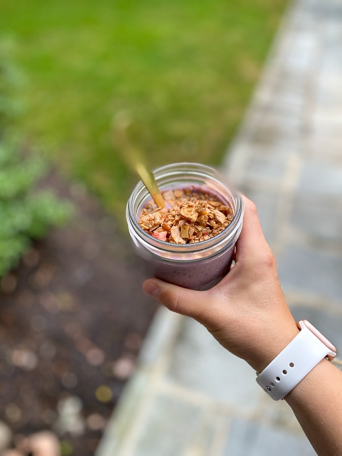 Berry smoothie with Seven Sundays muesli on top! Since both of my boys love smoothies we have them every other day for breakfast. We rotate between berry vanilla, peanut butter banana vanilla, and peanut butter chocolate.