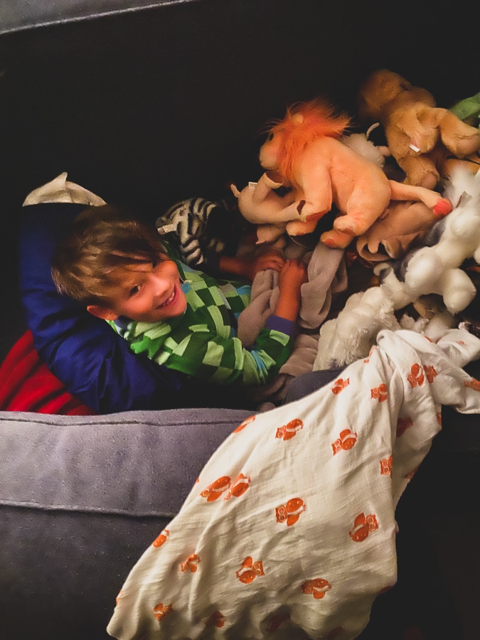 He actually slept in the basement last week in a “fort” made of couch cushions and all the animals around him.