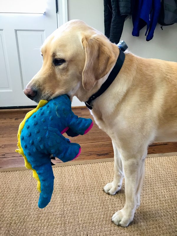 Gus caught a dinosaur!!! Like many dogs, Gus loves to chew up toys. My mom bought him this dinosaur, lovingly named “Dolly” in our house, and he has yet to make a hole in her. The brand claims that the fabric is nearly indestructible, and we’ve had Dolly since the fall with good luck. I think it is SO DARN CUTE that he carries Dolly around with him. She also squeaks!