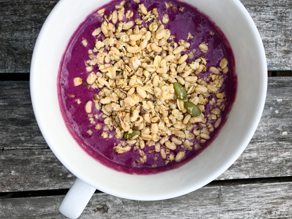 ^^Purple berry smoothie bowl with Nature’s Path granola.