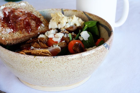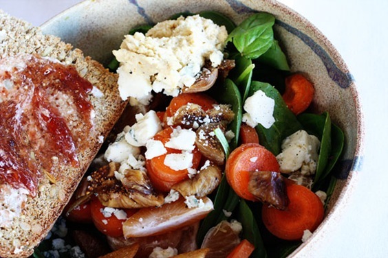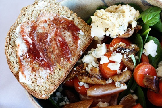 After showers, lunch was a salad topped with clementine, hummus, bleu cheese, carrot, spinach, vinegar, wheat thins and toast with butter and strawberry jam!