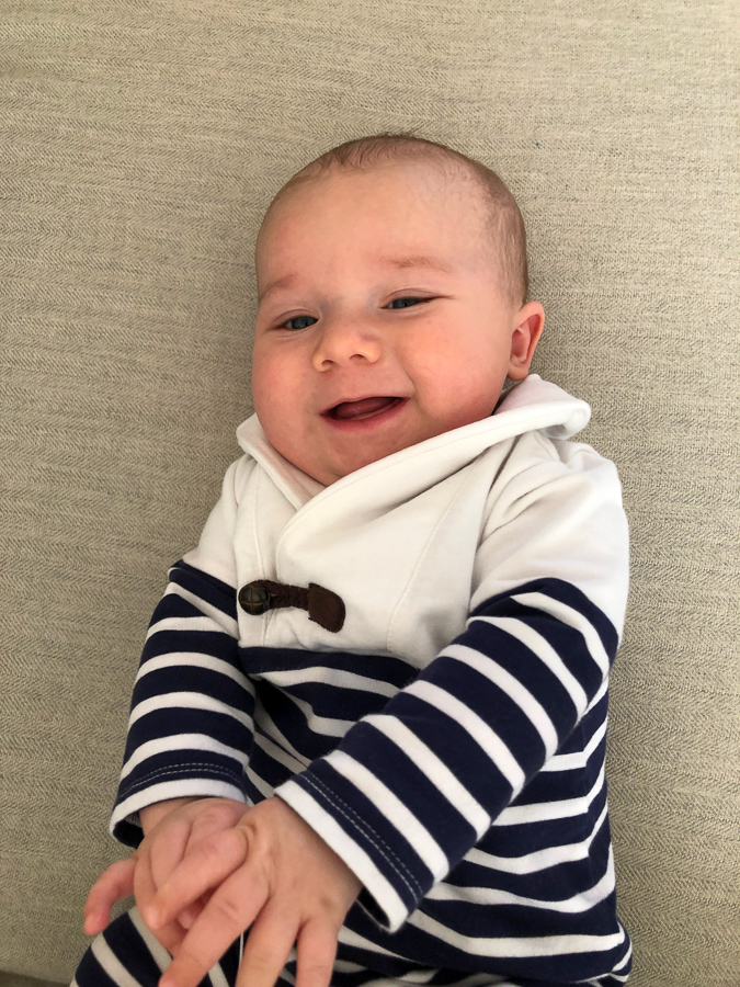 Note the hand on chest. That is not some cute gesture – he’s just wiping Goldfish crumbs on his shirt.
