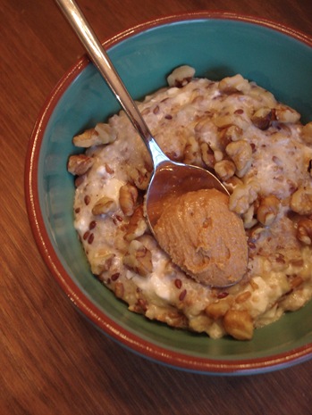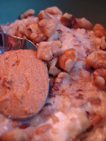 I added more cottage cheese than usual and some walnuts because this breakfast needs to get me through my test and to the airport. The extra cottage cheese kind of ruined the creamy consistency (it was more mucousy – sorry) so note to self that 1/8-1/4 cup is best for my liking.