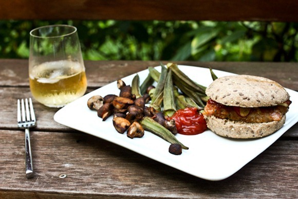 It took me a while to decide what to make, but I knew okra fries were most appealing. I ended up cutting the chicken sausage in half (I only got one for us because he was pretty big) and making burgers with it!