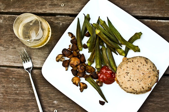 The okra fries and mushrooms were coated in canola misto spray, Liquid Smoke, salt and pepper and roasted at 400* for about 20 minutes