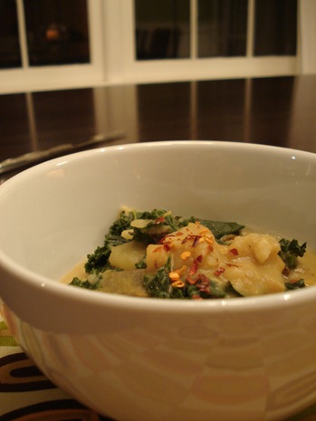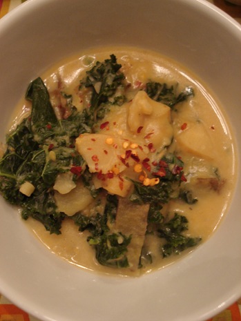 This was about 3-4 cups root veggies, mashed, about a veggie plastic bag’s worth of trimmed kale, 2 cups broth, 1 cup milk, and a sprinkle of flour for thickening. First we steamed the kale in a little broth and then added all the rest. Also involved were red pepper flakes, all spice, S+P.