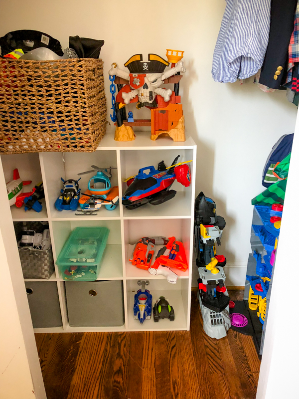That is a good lesson though, because like they say about junk food – out of sight, out of mind! So, my goal was to take his toys out of bins and display them on the shelves.