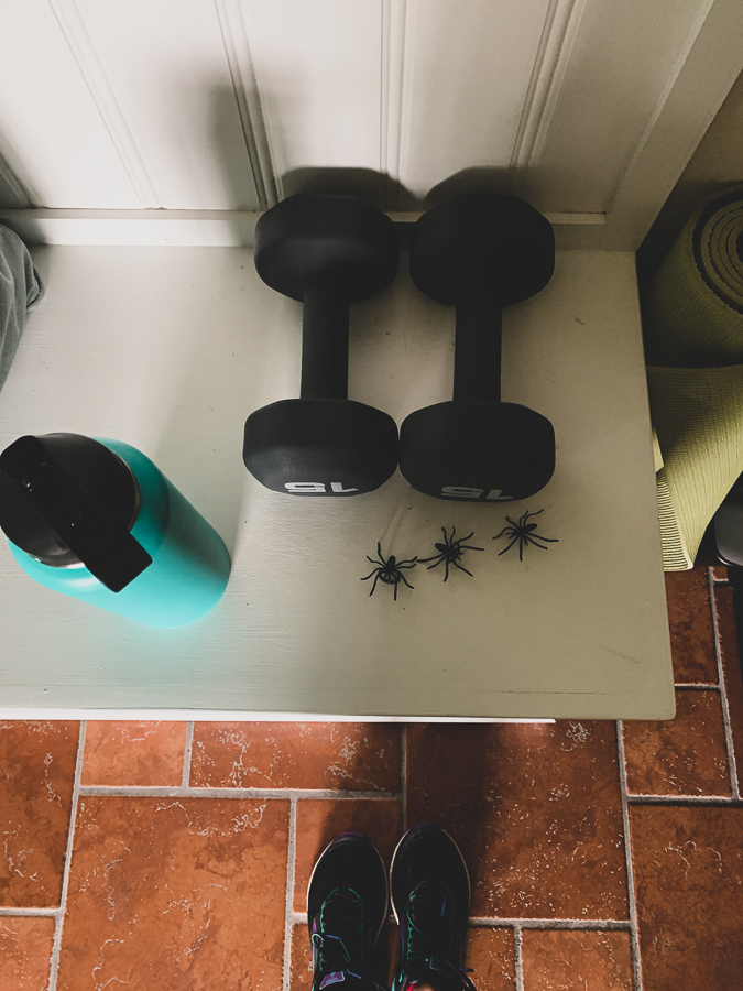 Those kids play “secret base” in my house all the time, and they run in and out hiding things. Like when I found these three spiders next to my weights the next day.