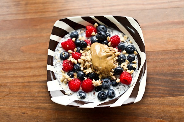It was actually 5 minute oats – meaning I made it this morning. I used pretty much the same recipe for overnight oats with just a little bit less milk since I knew I wouldn’t have the time for the oats and chia seeds to soak it all up. In the bowl: 1/3 cup oats, 1/4 cup milk, 1/3+ cup plain yogurt, 1 tbsp chia seeds, pinch salt, all stirred together. Topped with fresh berries, Nature’s Path granola, sunflower butter.