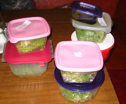We obviously haven’t eaten yet, but here’s a photo of the salads, all packed and ready to go.